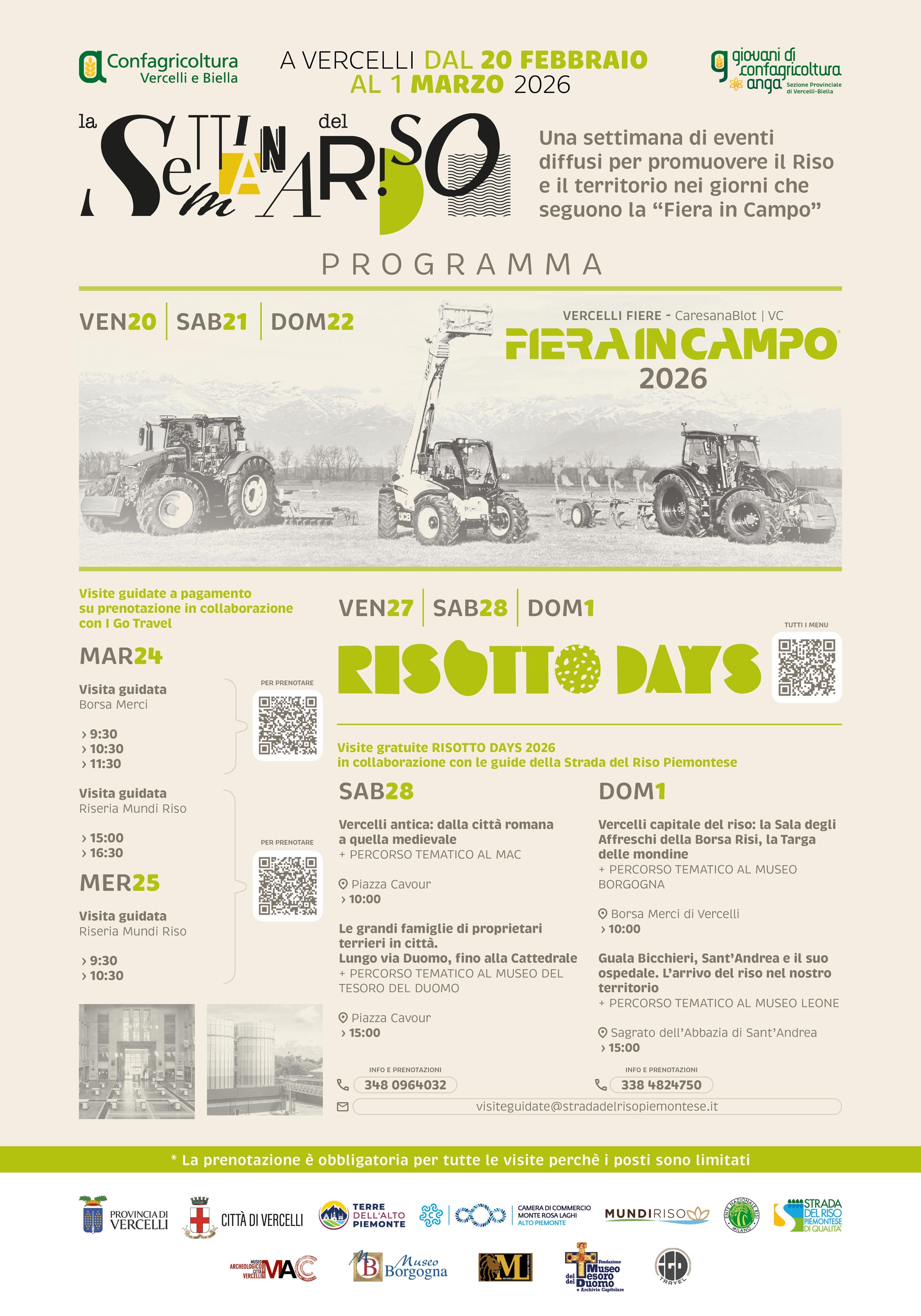 Dal 20 febbraio al 1° marzo 2026 si svolgerà a Vercelli la Settimana del Riso: una rassegna di convegni e degustazioni per promuovere il riso e il territorio nei giorni che seguono la "Fiera in Campo".